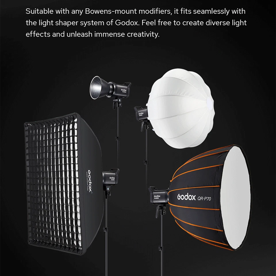The standard Bowens S-Type mount is compatible with a wide range of light modifiers, such as softboxes, beauty dishes, barn doors, and reflectors, making it perfect for studio and on-location setups. -